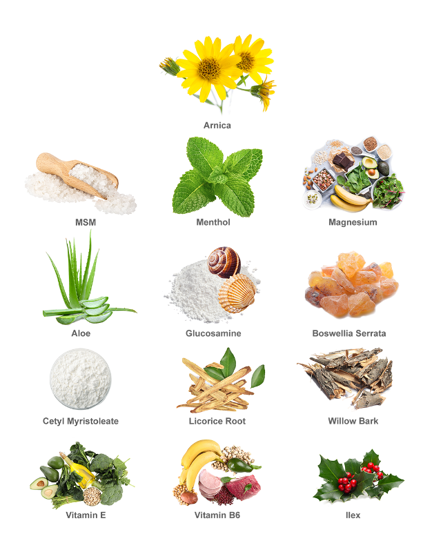 Menthol, arnica, MSM, magnesium, glucosamine, boswellia serrata, cetyl myristoleate, licorice root, willow bark, vitamin B6, vitamin E, ilex, aloe.